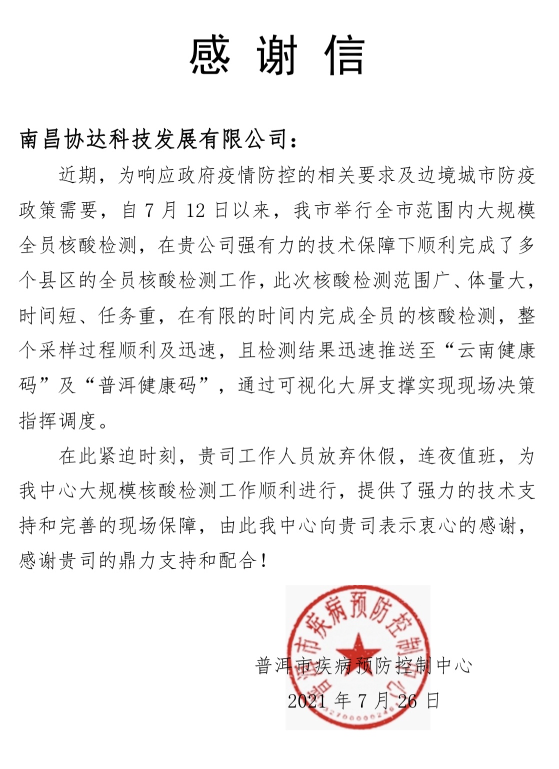 近日,我公司收到一封來自云南省普洱市疾控中心關(guān)于“技術(shù)保障云南邊境核酸檢測”的感謝信,我公司全體同仁除了感謝普洱市疾控中心肯定及信任之外,更多的是一份承諾和責(zé)任。多年來,協(xié)達科技一直用“匠心”精神踐行“贏得客戶尊重”的理念,始終秉持“匠心”專注一個行業(yè)、一件事,不辜負行業(yè),不辜負未來。