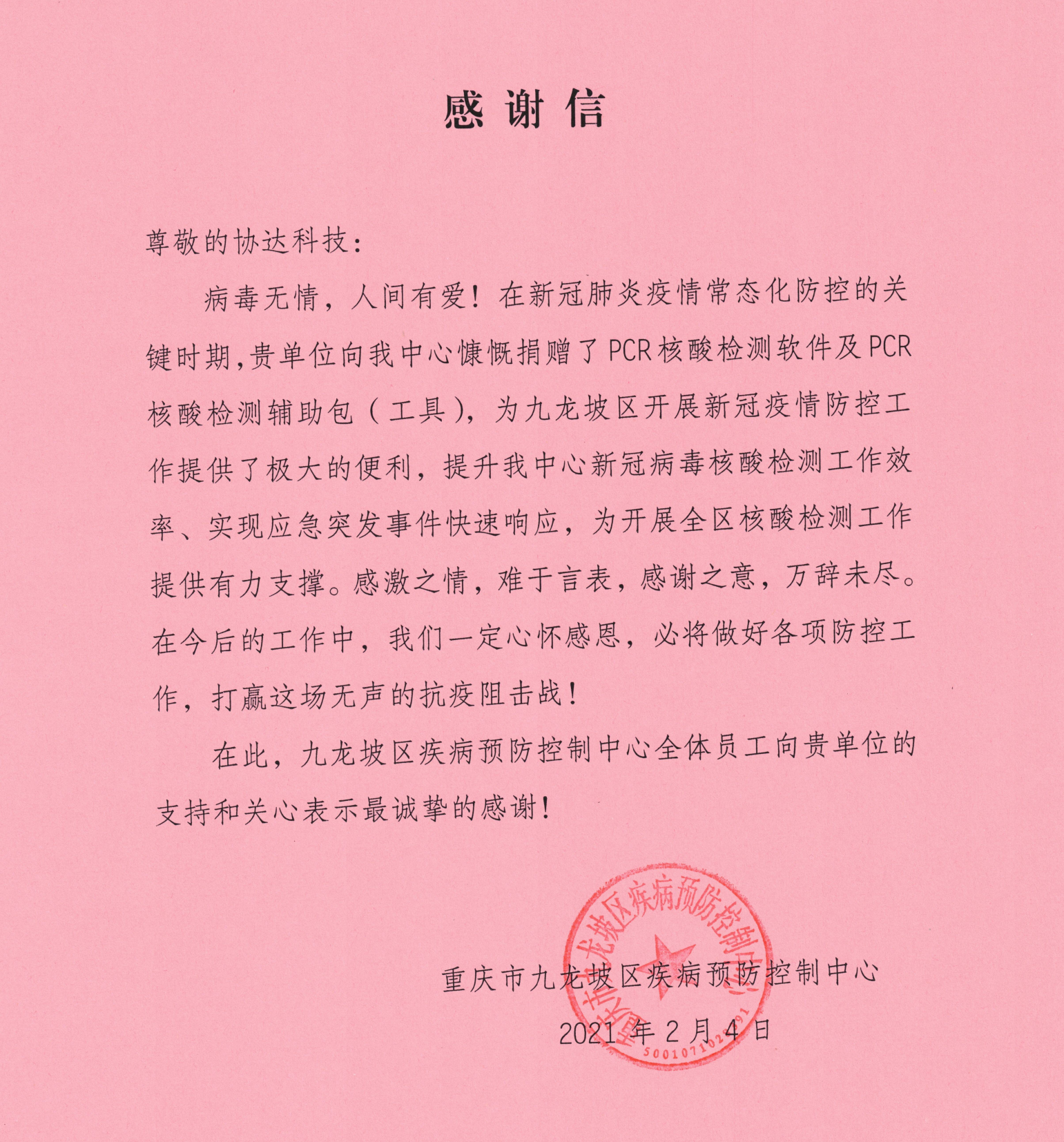 在小年夜,我公司收到重慶市九龍坡區(qū)疾控中心的感謝信,在雙方戰(zhàn)略合作伙伴關(guān)系下,我公司為中心疫情防控盡一份綿薄之力,同時履行公司的社會責任,最后,感謝中心的信任和支持,我公司將全力配合支持中心在疫情防控中相關(guān)的工作。